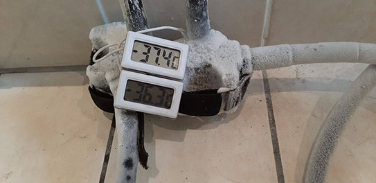 Unser Kollege Bastian Schmauser beim Einfrieren von nicht entleerten bzw. aufgrund der Systemgröße nicht entleerbaren Rohrleitungen. Dieses Spezialwerkzeug findet hauptsächlich bei großen Installationen seine Anwendung.